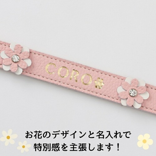 あなたの大切なお子様にぴったりな、フラワーネームカラーが新登場!お名前を刻んで、さらに愛らしさを引き立てるこの首輪は、お花とクリスタルが華やかに彩ります。
