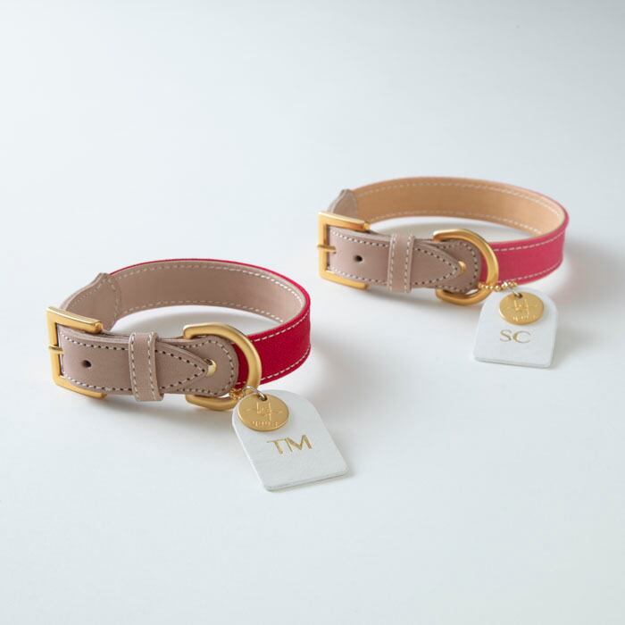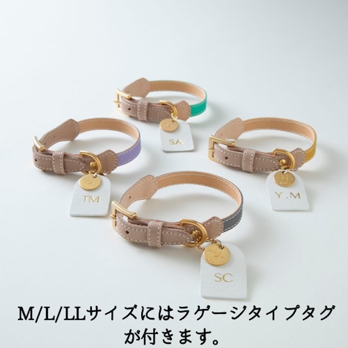 付属のレザータグ表にはイニシャル2文字、裏には名前と電話番号が入ります。金具色は、当ブランドこだわりの特注のソフトゴールド。